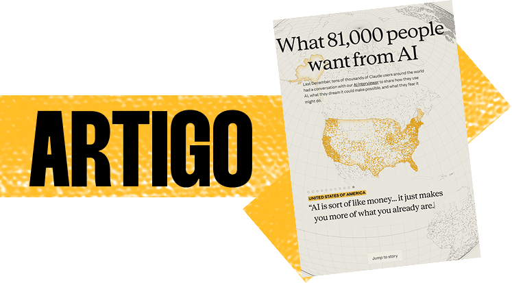 A Anthropic, empresa que criou o Claude, um dos principais concorrentes do ChatGPT, colocou agentes de IA para entrevistar 81 mil usuários sobre como eles usam inteligência artificial, o que esperam dela e o que temem. Maior pesquisa qualitativa já feita, 159 países, 70 línguas.